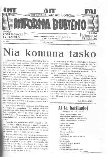 També van emprar profusament l’esperanto els anarquistes. La CNT va editar a Barcelona ja des del mateix juliol de 1936 un Informa Bulteno (Butlletí Informatiu), primer ciclostilat i a partir de juliol de 1937 imprès amb millor qualitat. Es va difondre ràpidament a nombrosos països, no només en medis anarquistes, com es dedueix de la notícia sobre el reclutament de Mladénov que hem citat anteriorment.